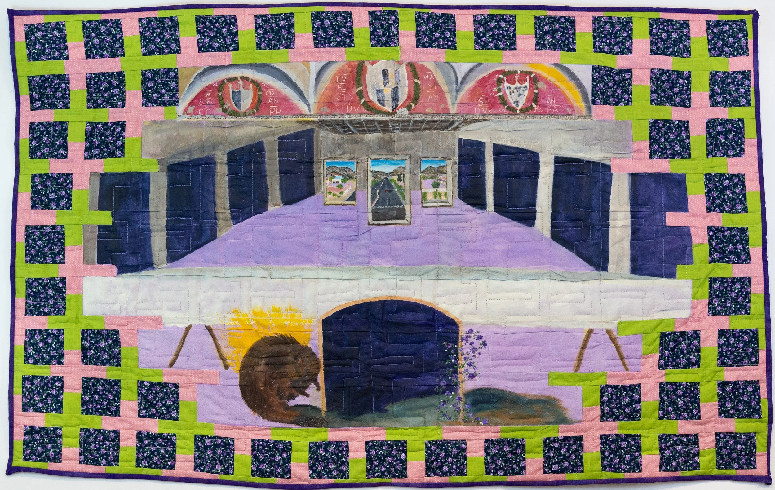 Acrylic paint, fabric, thread, on dyed single- weave canvas, machine quilted with 60/40 batting and fabric backing