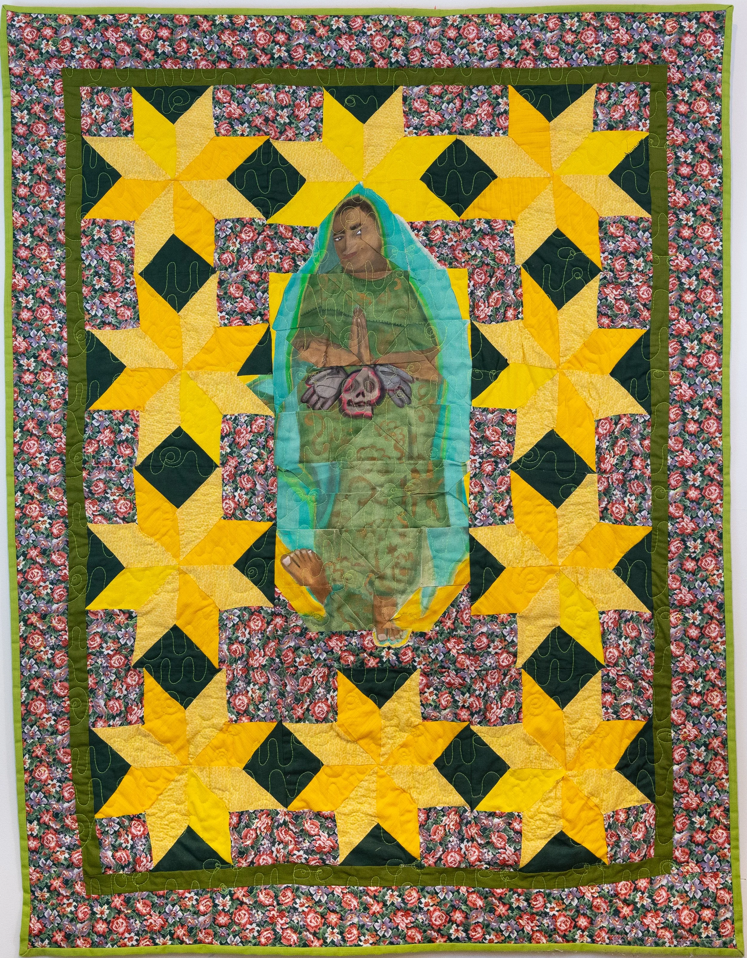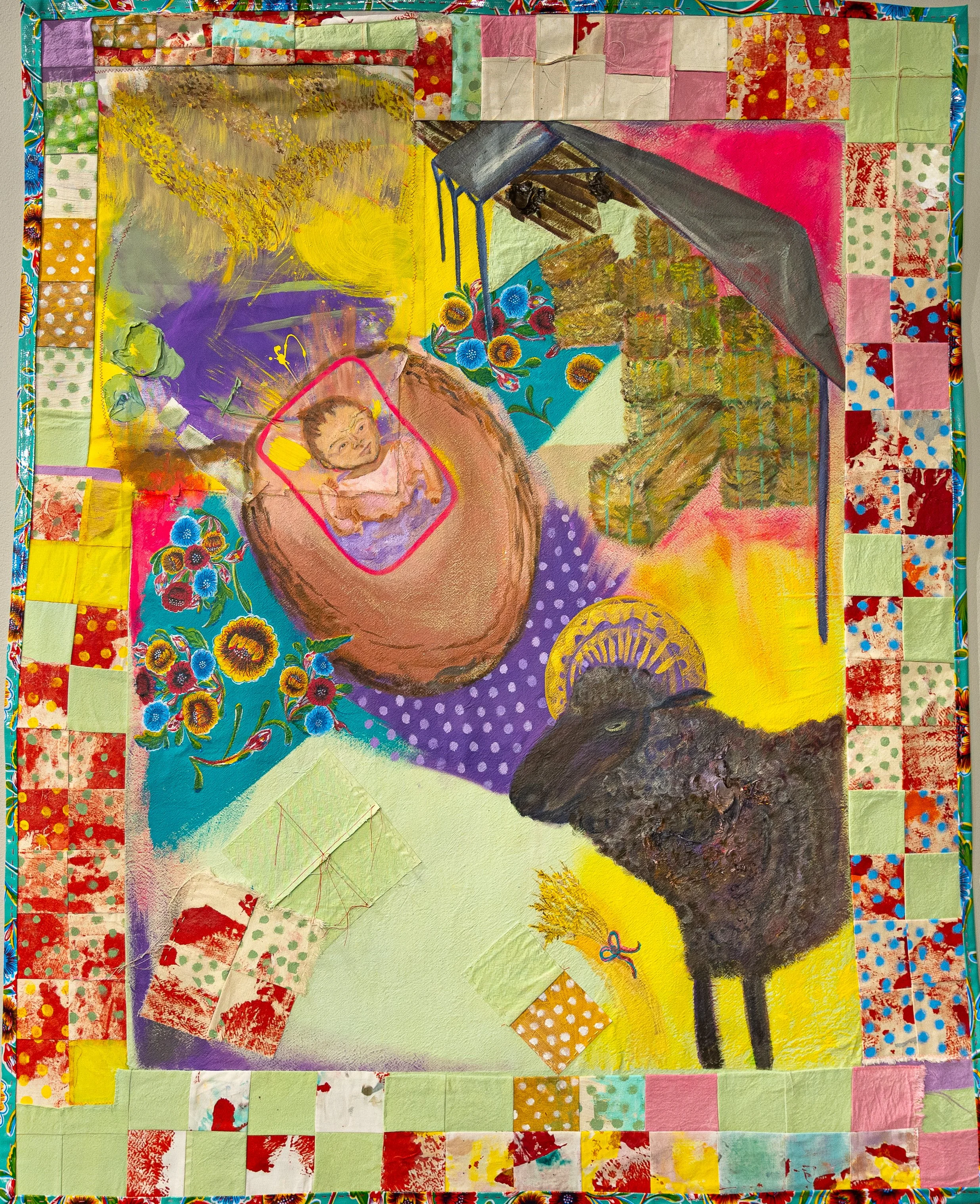 Acrylic, paint, fabric, thread, machine quilted with 60/40 batting and fabric backing